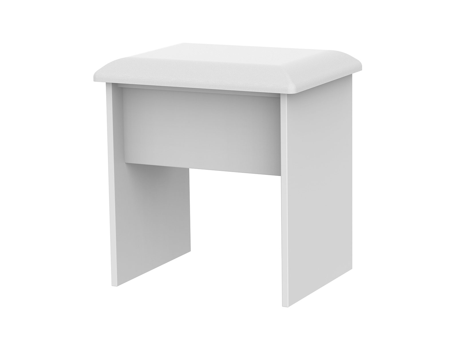 A small vanity stool. A light simple, yet sturdy design, with a soft cushioned seat. Makes an idea companion to a desk or vanity.